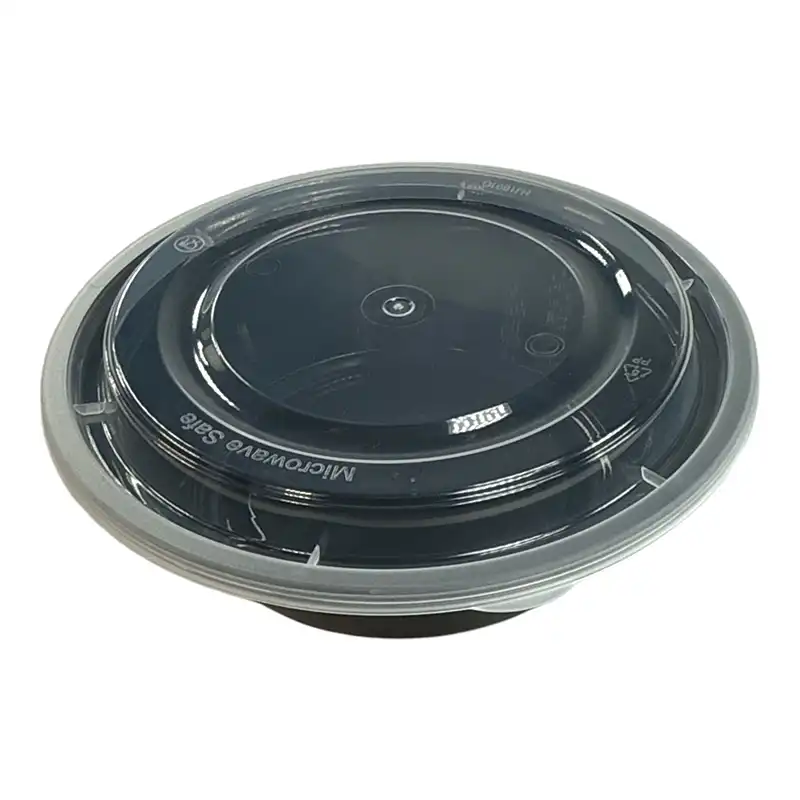 Engineered for high-capacity food storage and transport, this 48 oz. black round plastic disposable container with lid is ideal for large portions of meals like pastas, rice, salads, or entrees. Made from heavyweight, BPA-free plastic, it offers excellent durability for both hot and cold foods. As one of the most reliable disposable microwave safe containers, it allows for safe reheating without compromising quality.