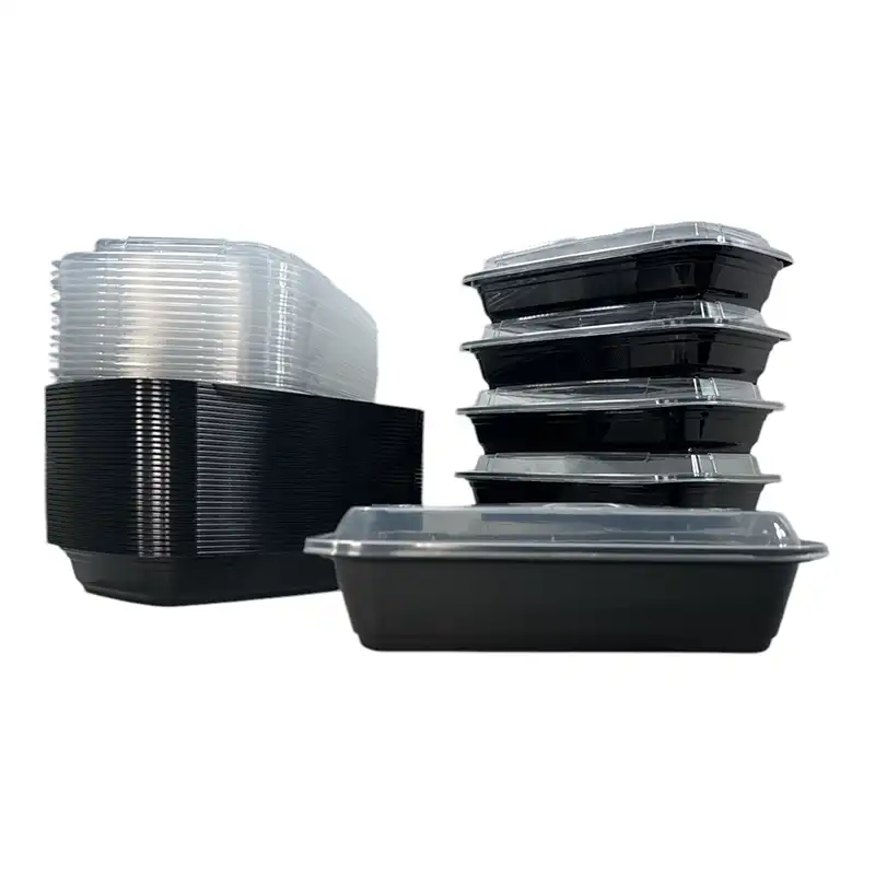 Perfect for takeout, meal prep, or food delivery services, these black rectangular plastic disposable containers with lids are made from premium heavyweight plastic, offering both durability and a sleek, professional appearance. Each container features a secure, tight-fitting lid to prevent spills and maintain food freshness—ideal for use as disposable carry out containers.